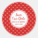 Agregue un toque de color a Save the Date Envelope con este sello para sobres rojo y blanco. Guardar la fecha, sus nombres y la fecha de boda se escriben en el centro de un círculo blanco rodeado de rojo. El anillo exterior está formado por pequeños corazones blancos sobre rojo. Fácil de personalizar.