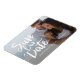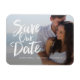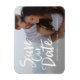 Moderno ahorra el diseño de fechas con las palabras "salva nuestra fecha" en un guión escrito a mano y blanco con una foto de la pareja feliz que se muestra detrás. En cualquier lugar de la tarjeta se pueden colocar los detalles de los bodas y los overlay blancos.