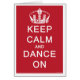 "Guarde la calma y la danza en" diseño en rojo tiene gente el ir de fiesta en una sala de baile delante de altavoces y de la bola de discoteca grandes en la forma de la corona de la obra clásica "para guardar calma y para continuar" los posters.