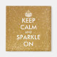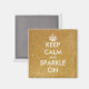 Guarde la calma y chispee en los imanes del purpurina del oro. El cuadrado guarda el imán tranquilo con falsa textura de oro del fondo. KeepCalm y su texto. Cree su propia parodia divertida. Chispas y luces tenues brillantes brillantes del purpurinoso. Impresión atractiva para las mujeres y los chicas.