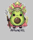 Un personaje aguacate adorable está vestido como un guerrero azteca, con una dirección vibrante, lanza y escudo. Los grandes ojos y las mejillas redondas del personaje le dan un toque lúdico a su atuendo guerrero.