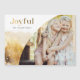 Moda, diseño moderno de vacaciones con elegante escritura personalizado "Joyful" en un estilo de gradiente dorado con una plantilla única de fotos curvada y sutiles acuarelas doradas estilo paisaje invernal.