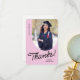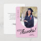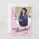 Una tarjeta de agradecimiento para graduados con una foto vertical con borde arqueado. Personaliza esta tarjeta rosa claro y negra con tu propio mensaje de gratitud o utiliza el que se muestra.