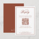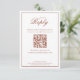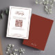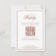 Fije el tono de su día especial con esta elegante tarjeta RSVP nupcial en un minimalista diseño de vino de Borgoña. Presenta un guión clásico de caligrafía y una tipografía tradicional, que combina el encanto atemporal con la elegancia tradicional. La plantilla de código QR integrada permite a los clientes recibir RSVP con facilidad, mientras que el texto de la respuesta amable añade un toque personal. Esta elegante tarjeta de respuesta de huéspedes complementa un elegante diseño formal y se empareja con su suite de papel para un aspecto cohesivo.