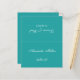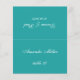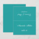 Una simple tarjeta de boda verde azulada (azul) con el nombre del invitado y el número de la mesa impreso en la parte delantera y los nombres de novios y novios y la fecha del boda impresa en el otro lado (es la otra mitad, antes de doblarla). Todo el texto es un guión caligráfico blanco. Tamaño: 4,5" x 5,6" antes del plegado, es decir, 4,5" x 2,8" después del plegado.