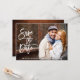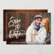 Guión De Pincel Moderno Guardar La Tarjeta De Foto De La Invitación De Compromiso De Fecha - Guión Blanco, Madera Rústica Atrás