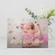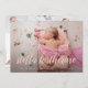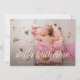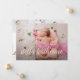 Los elegantes anuncios de nacimiento muestran tu foto favorita del recién nacido en sangre completa, con el nombre del bebé en un guión de caligrafía rosa rubor. Personaliza con las estadísticas de nacimiento de los bebés debajo. Añade seis fotos adicionales a la parte posterior en un diseño de collage, con los nombres de los padres o de la familia en el centro.