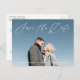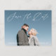 Elegante y elegante, guardar las postales de la invitación fotográfica de fecha incluye tu foto de compromiso favorita con "Save The Date" en un diseño moderno de escritura caligráfica. Personalice la moda para guardar los anuncios de fechas agregando sus nombres y detalles del boda.