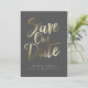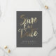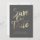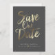 Este diseño presenta las palabras "guardar la fecha" en un guión manuscrito dorado. A continuación se muestran los nombres de la pareja y los detalles del boda, que se pueden personalizar. El color de fondo también es personalizable.