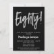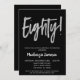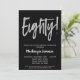 Una elegante, simple pero llamativa invitación a la fiesta de cumpleaños 80 en negro y plata. Texto del guión de Glam en la parte superior y texto plateado debajo con el nombre en blanco resaltado