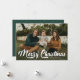 Elegante tarjeta de vacaciones con tu foto horizontal en la parte delantera con "Feliz Navidad" mostrada en un atrevido retro guión. Personalice la parte delantera de la tarjeta de Navidades fotográficos con su apellido y el año. La tarjeta se invierte para mostrar una foto adicional enmarcada en blanco con un fondo verde oscuro con puntos blancos sutiles.