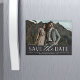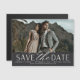 Un moderno ahorra el imán de fecha diseñado para acomodar una única foto de compromiso horizontal o orientada al paisaje. "Guardar la fecha" aparece debajo del bloque de moda y el guión de guión, con sus nombres, fecha de boda y ubicación del boda debajo, junto con su sitio web boda o detalles adicionales.