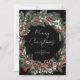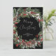 Difunde la alegría navideña con estilo este año con esta tarjeta de Navidad con corona botánica de bayas rojas. Muestra a tus amigos y familiares que te importa con una tarjeta de Navidad elegante y moderna que seguramente alegrará el día de cualquiera. Con una corona festiva de vegetación de pino, eucalipto, bayas rojas y blancas y piñas en acuarela, esta tarjeta crea un diseño hermoso sobre un fondo negro rico. La escritura a mano informal dice "Feliz Navidad" y puede ser personalizada con tu propio mensaje de "Felices Fiestas", "Feliz Janucá" o cualquier otra cosa. La parte trasera de la tarjeta presenta un patrón botánico general sobre un fondo negro para un aspecto extra festivo y detallado. Perfecta para familias jóvenes millennials, esta tarjeta de Navidad dejará una impresión memorable durante la temporada de fiestas. Envía a tus seres queridos un poco de alegría con esta tarjeta de Navidad con corona botánica de bayas rojas. Copyright Elegant Invites, todos los derechos reservados.
