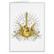 El diseño musical al estilo de la fantasía presenta una guitarra alada dorada con acentos regañadores y notas musicales.