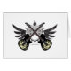 Guitarras y cráneos cruzados en las camisetas y los regalos para los guitarristas y los amantes de la música. Guitarras bajas con los cráneos y el fondo de la heráldica.