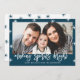 Celebra la temporada navideña con tarjetas de fotos personalizados. El moderno diseño de vacaciones cuenta con un esquema de color blanco y marino, gráficos de estrellas festivas, superposición de tipos de letra de guión de moda y marcadores de posición para una foto y un texto. La tarjeta es perfecta para celebrar Navidades, Hanukah o Año Nuevo.