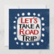 "Let's Take A Road Trip" es un lindo diseño de texto en azul con texto en negro y rojo. Las palabras tienen una forma de acento blanco y están rodeadas de adorables puntos blancos y caprichosos.
