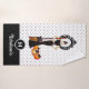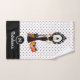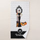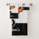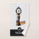 Diseñado por Farida Greenfield. Un ilustracion de moda de una dama con un hermoso y elegante vestido negro largo y elegante, con una escoba de brujas decorada con cintas negras con calabazas en el primer plano y un patrón de puntos de polka blanco y negro en el fondo. Tiene personalizable monograma inicial y nombre en la parte inferior. Diseño perfecto con tema de Halloween.