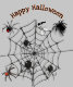 Grandes y feas arañas trepan por la red y parece que atraparon a su próxima víctima. La pobre mosca está envuelta en la red gritando por ayuda. Feliz texto negro y naranja de Halloween.