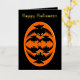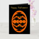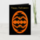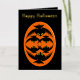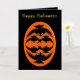 Esta increíble tarjeta de Relieve metalizado de Halloween presenta un oval naranja con seis cuervos. Cada cuervo tiene ojos amarillos con pupilas negras y alas estiradas. Los cuervos están volando unos hacia otros formando una forma oval. El fondo es negro. Hay un texto personalizado dentro para que puedas personalizar esta tarjeta. El texto personalizado en el frente está en un hermoso Relieve metalizado de oro.