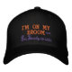 Se muestra en negro con un texto bordado de dos tonos en los colores naranja y violeta. Front tiene el texto "Estoy en mi escoba y estoy listo para andar". Los lados tienen "feliz" y "Halloween". La parte trasera tiene el texto de "USA". Personalizar esta gorra de béisbol a sus opciones de color o compre según lo diseñado.