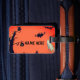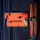 Feliz ilustracion de Halloween. Árbol de fondo naranja, tumbas, búho, murciélagos, araña. Añade tu nombre para personalizar.