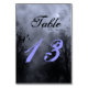 Una tarjeta de mesa personalizado con guion grunge de texto delante y atrás y el arte de un espeluznante cielo de Halloween con árboles nublados a lo largo de un oscuro camino embrujado, cuervos góticos y una luna llena nublada con un sabroso tinte azul. Personalizar Para cambiar fuentes, letras de colores, incluso guardar el diseño para más adelante.