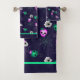 Calaveras coloridas de neón rosa y esmeralda brillantes, estrellas, flores oscuras y telaraña
