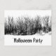 Postal de invitación del Partido de Halloween, con un diseño de tipografía espeluznante y una imagen de madera embrujada en blanco y negro. Con texto en blanco y negro, puede agregar su propia información. Un temática gótica espeluznante para planear tu próximo disfraz o celebración de Halloween.