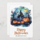 Tarjeta de Halloween con una mansión embrujada, la luna, murciélagos y espeluznantes lámparas o’lanterns. Personalice fácilmente esta tarjeta acuarela de Halloween con su nombre y texto familiar.