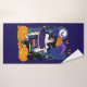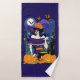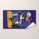 Una bruja vestida de morado llevando el cráneo de azúcar del maquillaje muerto. Gato negro, caldero, calabazas, luna llena