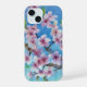 A hand painted watercolour artwork of cherry blossoms on tree branches. A blue sky background makes the blossoms pop, and evokes memories of sunnier days.