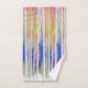 Bright multicolored bath towel set printed with a handpainted watercolor rainbow sunset birch forest illustration by Anne Londez. Perfect for a cheerful woodland bathroom decor! Check out the matching shower curtain and bath mats.