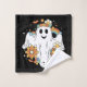 Toalla puesta con el ilustracion de un fantasma sonriente. Decorado con flores, arcos de lluvia y murciélagos.