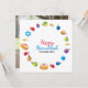 Este diseño de vacaciones incluye el texto "Hanukkah feliz" en la tipografía moderna de color rojo y azul rodeada de dreidels, monedas de oro, estrellas y sufganiyah. Personalizado con tu nombre y foto favorita en la parte de atrás. #hanukkah #chanukah #vacaciones #estacional #festividad #moderna #dreidel #star #moneda #oro #starofdavid diseño #tarjetas de diseño #saludos #tarjetas de felicitación #papel #foto #tarjetas de fotos