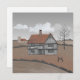 Colourful artwork of an old medieval house in the English countryside, with an old church in the background, and a couple of hares boxing in the foreground. Perfect for anyone who loves folk art.