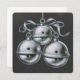 Una tarjeta de Navidades minimalistas con un delicado dibujo de tres campanas colgadas. El reverso de la tarjeta dice "Hark, How the Bells".
