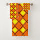 Este juego de toallas tiene un diseño de los años 70 de diamantes de color amarillo sólido dentro de los contornos de diamantes marrones en un campo de naranja.