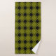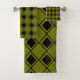 Este conjunto de toallas tiene un diseño moderno de mediados de siglo de diamantes negros sólidos dentro de los contornos de diamante negro en un campo de verde.