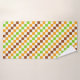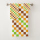 A vibrant checkered pattern of alternating green, orange, and brown squares on a white background. The design creates a lively, geometric feel.