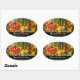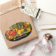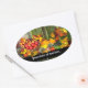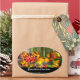 Un colorido pegatina del tiempo de cosecha con frutas y verduras, flores y hojas a través de una cerca de madera, añada el texto de su elección.
