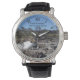 Reloj de pulsera redondo plateado con la represa de desviación de la incubadora de peces en el río Feather.