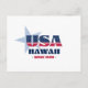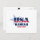 Postal de Hawái. Un diseño tipográfico creativo que encapsula la esencia de Hawaii con colores rojo, blanco y azul audaces y elementos patrióticos, incluidas estrellas y rayas.
