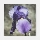 Fotografía de una flor de iris morado nueva. El fondo es una roca en el jardín.