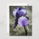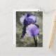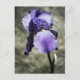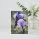 Fotografía de una flor de iris morado nueva. El fondo es una roca en el jardín.
