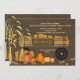 Una invitación vibrante, de otoño, perfecta para cualquier cumpleaños de edad. Presenta un vehículo agrícola con un cartel que dice "paseos en heno". Hay manojos de maíz, calabazas y hojas de otoño en el suelo.