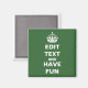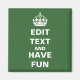 Edite texto para crear su propio imán de parodia "Keep Calm and Carry On". Haga clic en "Personalizar" y luego en "Editar" para cambiar el fondo a cualquier color.