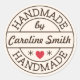 Pegatina hecha a mano con el texto "hecho a mano" en marrón diseñado como sello y corazón rojo. Nombre del personalizable.