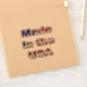 pegatina vinílico cortado por personalizados con una imagen de la frase "Hecho en Estados Unidos" en negritas letras de la bandera estadounidense. Ver pegatina redondo, confeti, bolso de favor, etiqueta de favor, etiqueta y papel de envoltura. Ver toda la colección de Pegatinas Patriotic 40 en los INVITES | Sección Pegatinas y etiquetas.