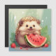 ilustracion encantador de un erizo disfrutando de una sandía. El erizo tiene una expresión feliz, con los ojos cerrados de maravilla, y está rodeado de algunas fresas y hojas. El estilo de sketch de tinta añade un toque caprichoso y bonito a la escena.